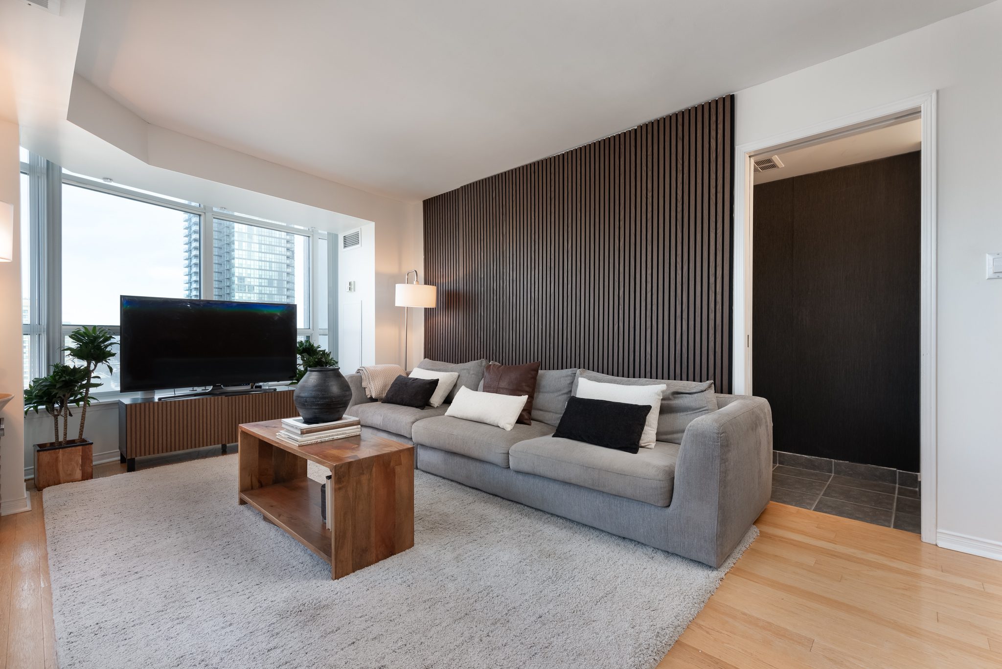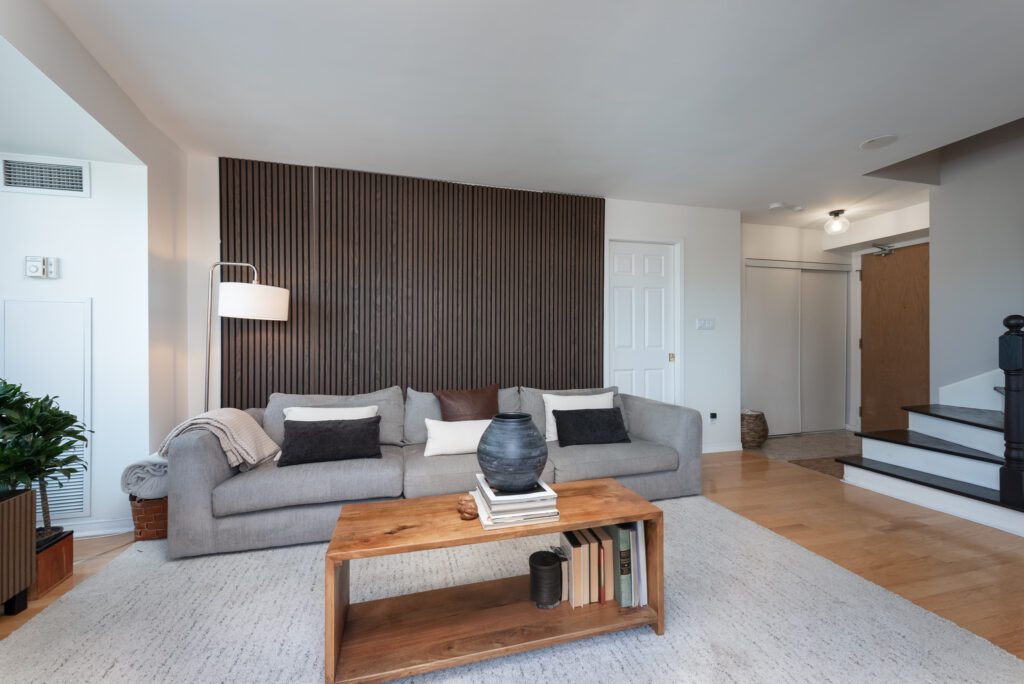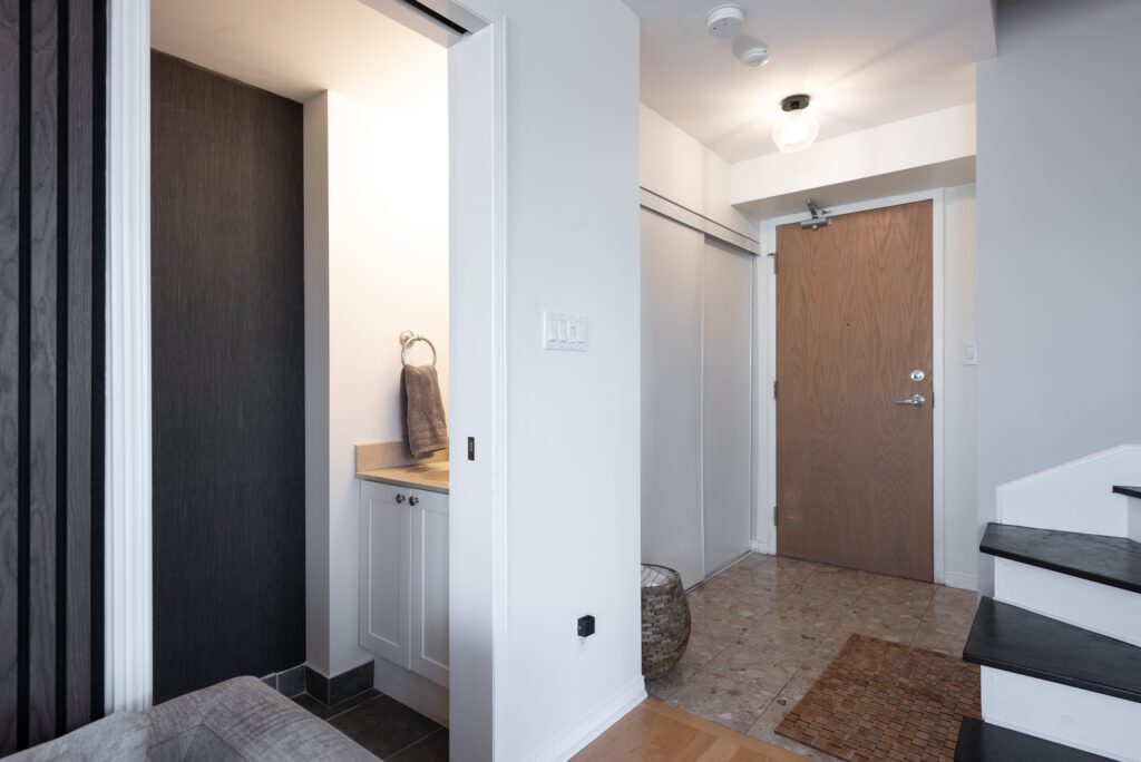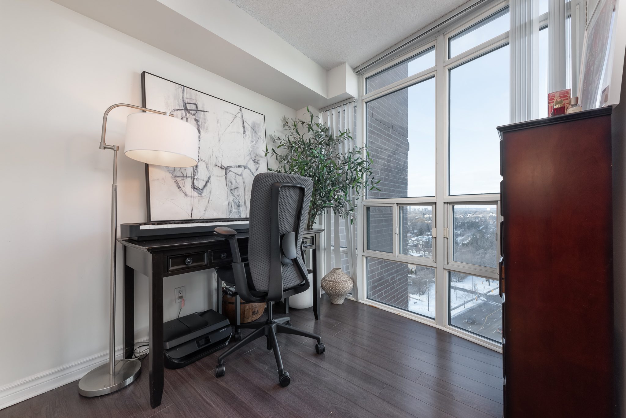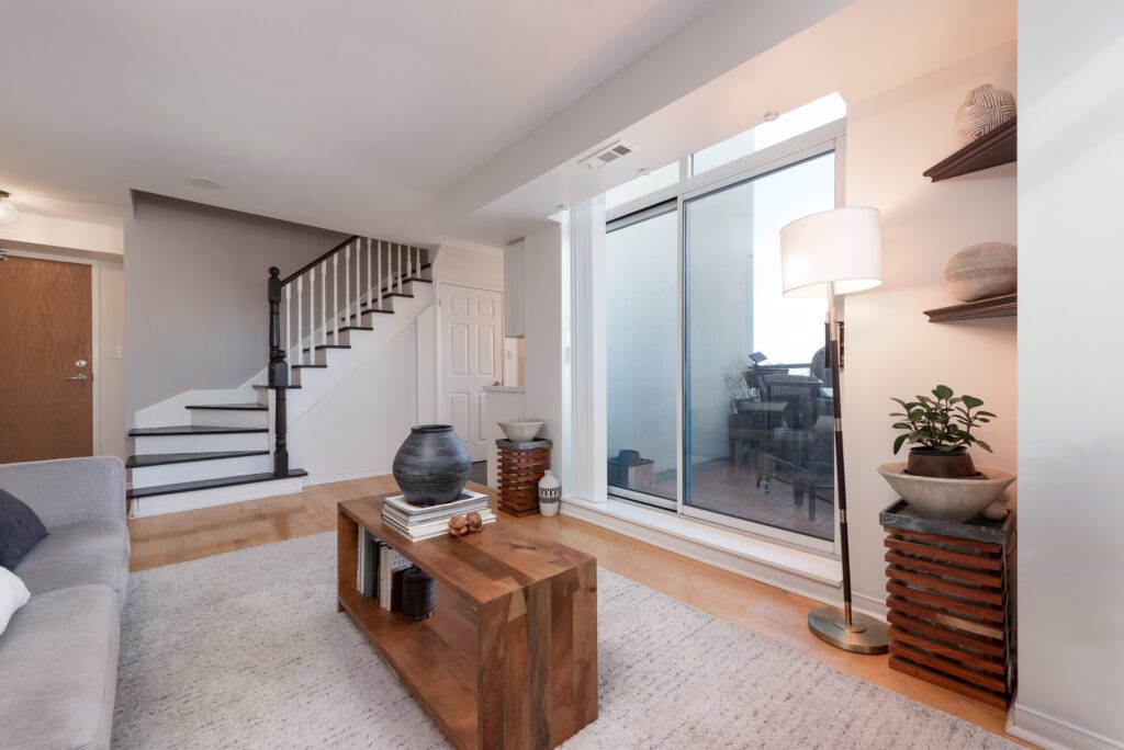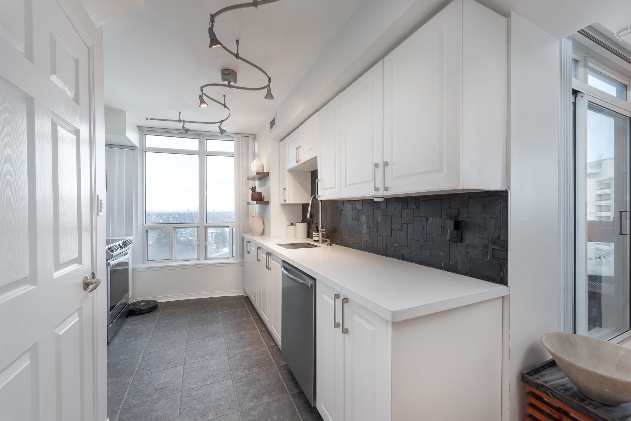 Bathed in natural light through expansive floor-to-ceiling windows, this meticulously designed space offers a perfect blend of style and functionality. The heart of the home is an upgraded kitchen featuring luxurious quartz countertops, custom cabinetry, elegant slate backsplash, and state-of-the-art stainless-steel appliances. Warm hardwood floors and the living room’s abundant natural light create an inviting and cozy atmosphere. Upstairs is a spacious primary with corner NE views, ample closet space with organizers and a 4 pc ensuite. The versatile den—complete with pocket doors—seamlessly transforms from a private office to an additional bedroom.