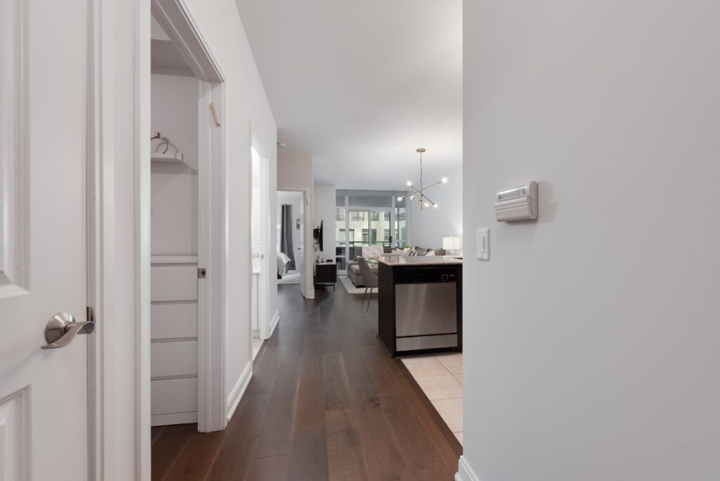 Morning coffee is a treat on the south-facing balcony, complete with a decorative floor for added style. The U-shaped kitchen boasts granite counters and stainless steel appliances, perfect for whipping up meals when inspiration strikes, while wide-plank hardwood (2022) throughout adds warmth and character. Both the living area and primary bedroom offer walkouts, so fresh air and city vibes are always just a step away. There’s a convenient den with its own door for focused work-from-home days, plus extra-large laundry, closets with organizers, and two bathrooms,one a glass-enclosed shower and one an ensuite, keeping life easy and comfortable.