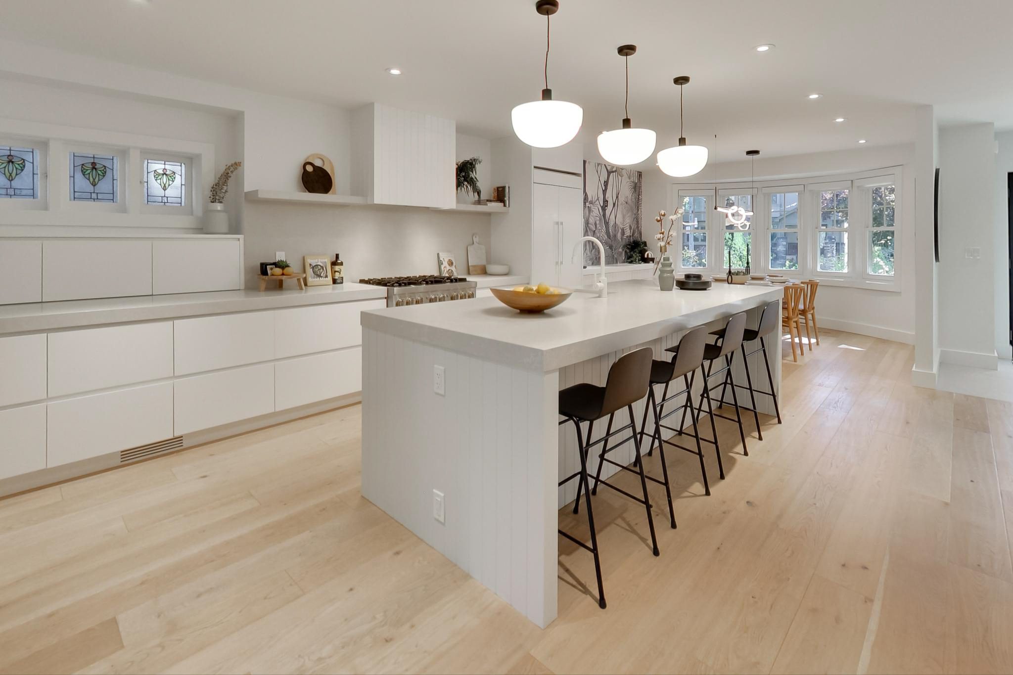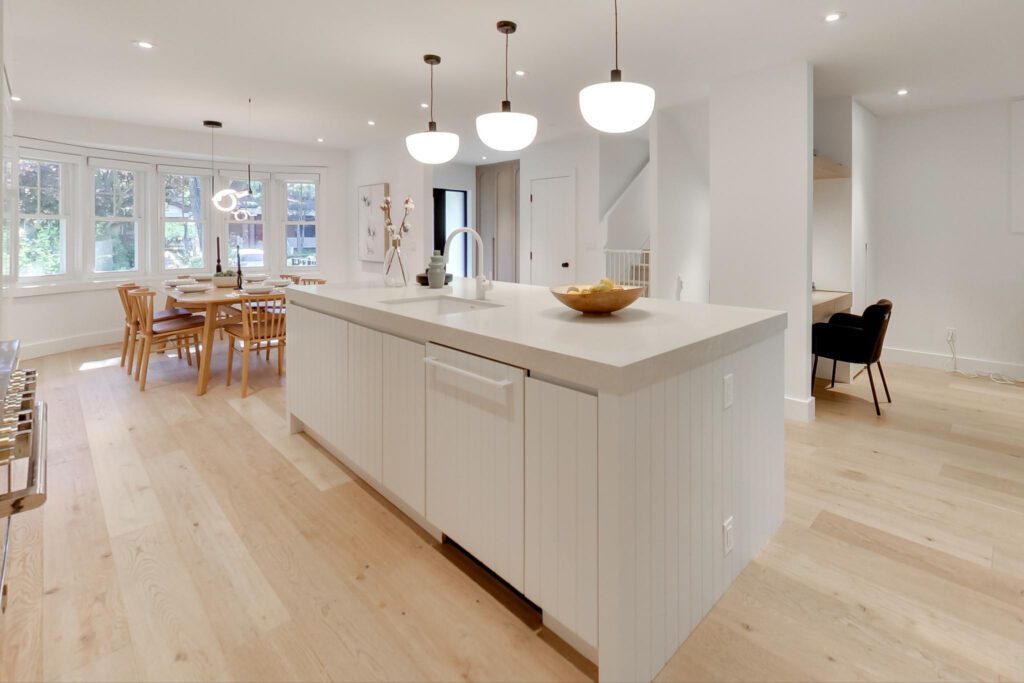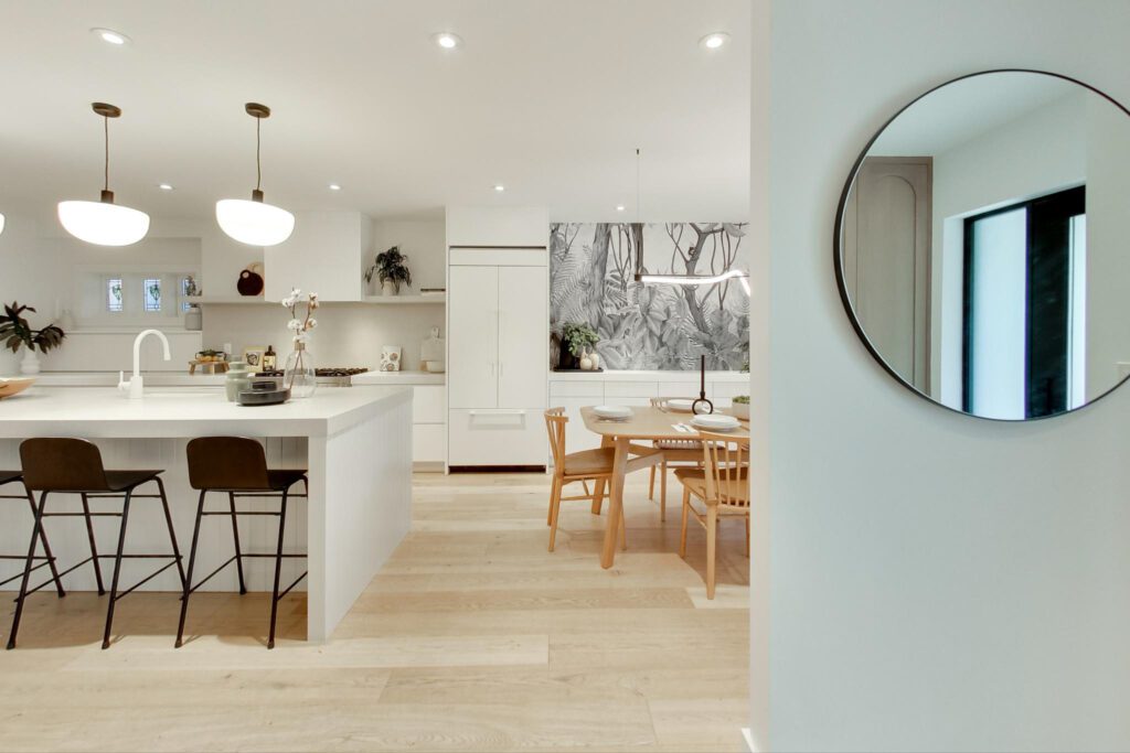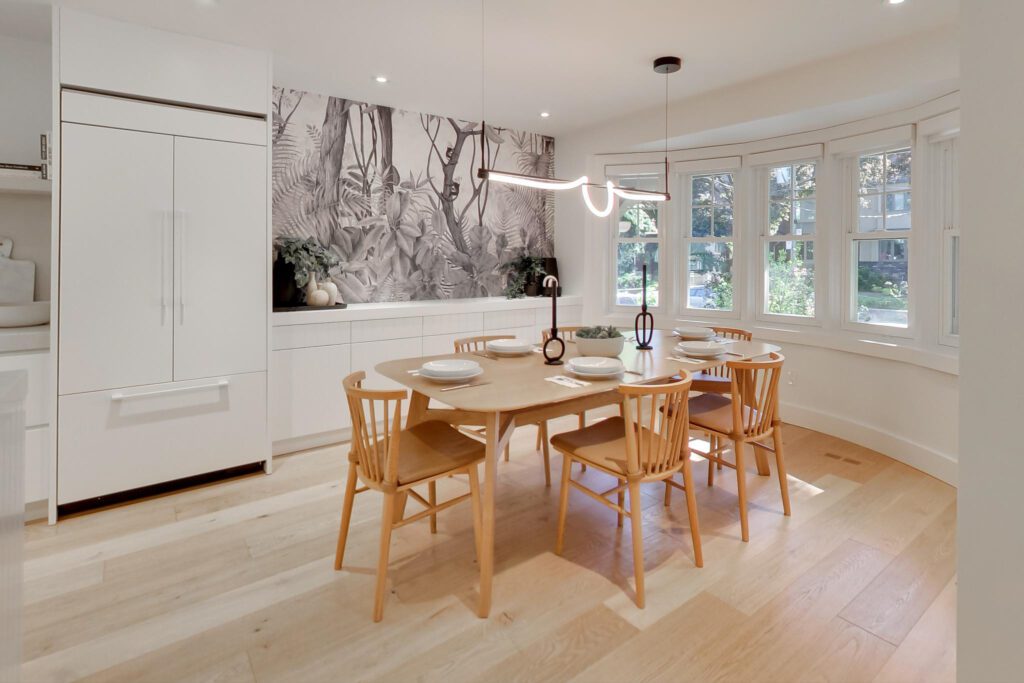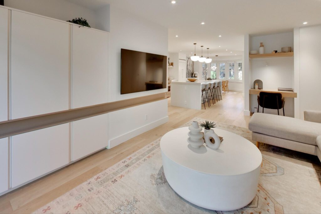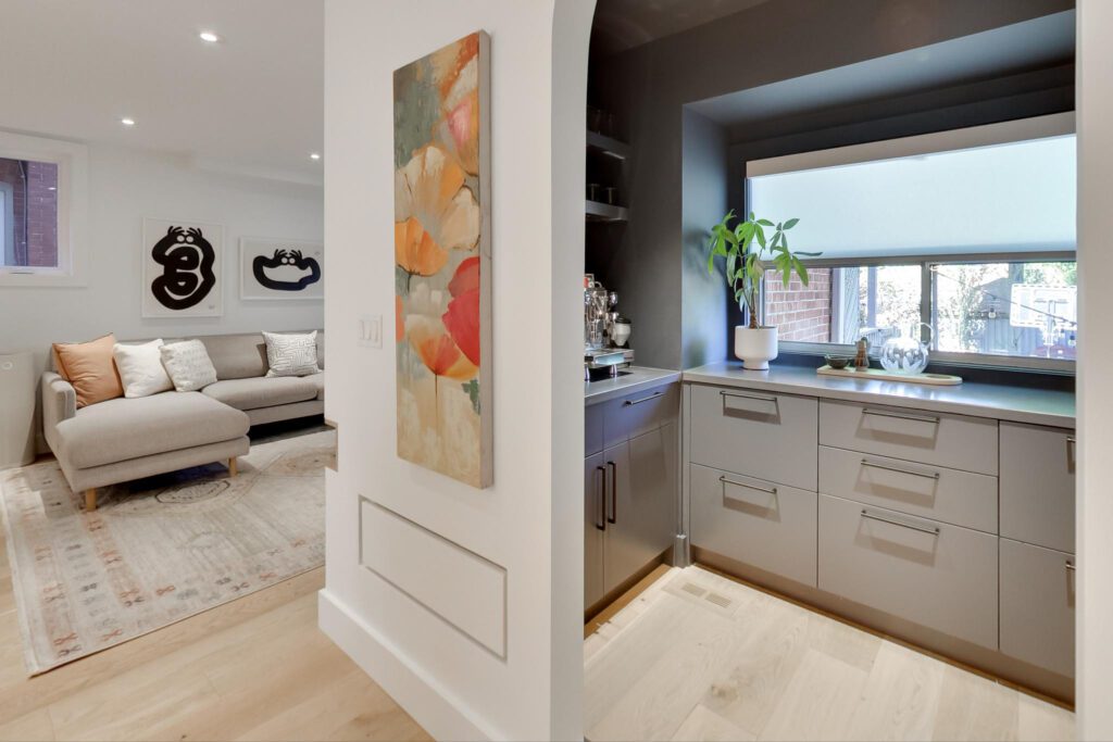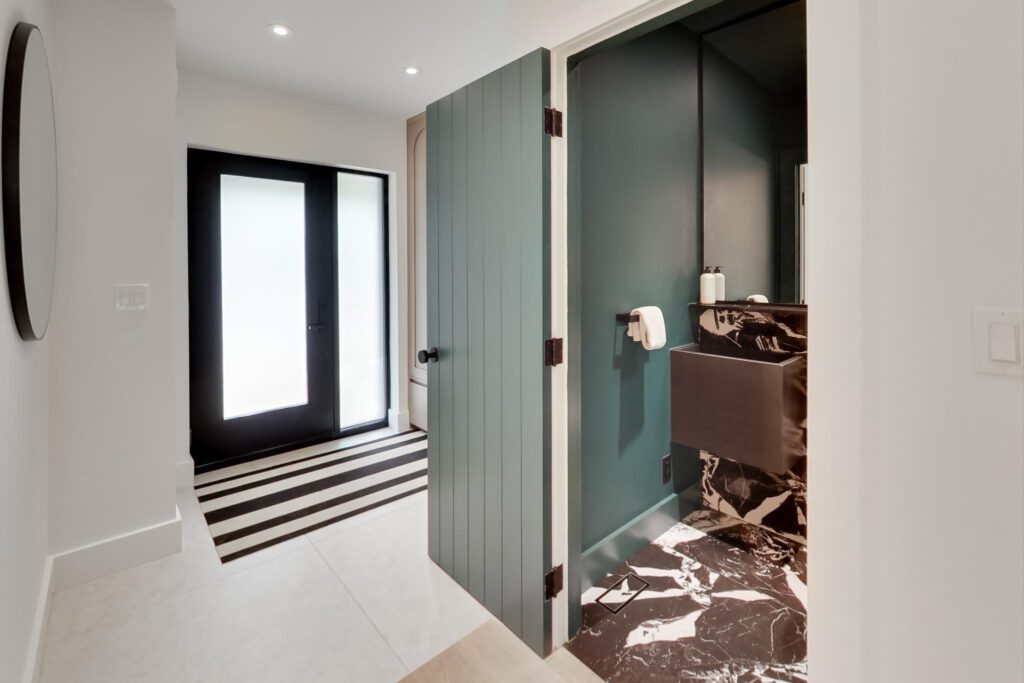 The focal point, a chef-inspired kitchen, boasts a massive Caesarstone island with abundant storage and seating with a clear view of the entire main floor. Integrated appliances, a six-burner stove, and custom built-ins, make this space as functional as it is beautiful. A pantry nook with a coffee station and a built-in dining room servery add to its allure. A nearby powder room is striking and showcases a custom floating marble vanity.