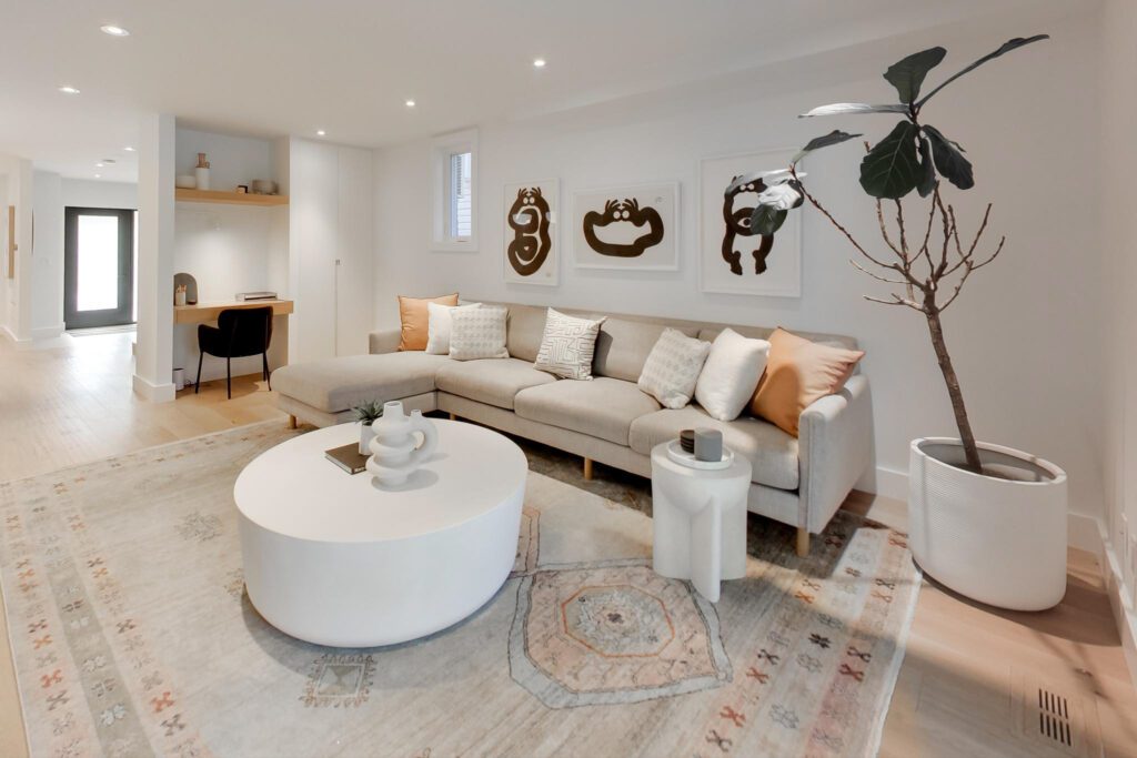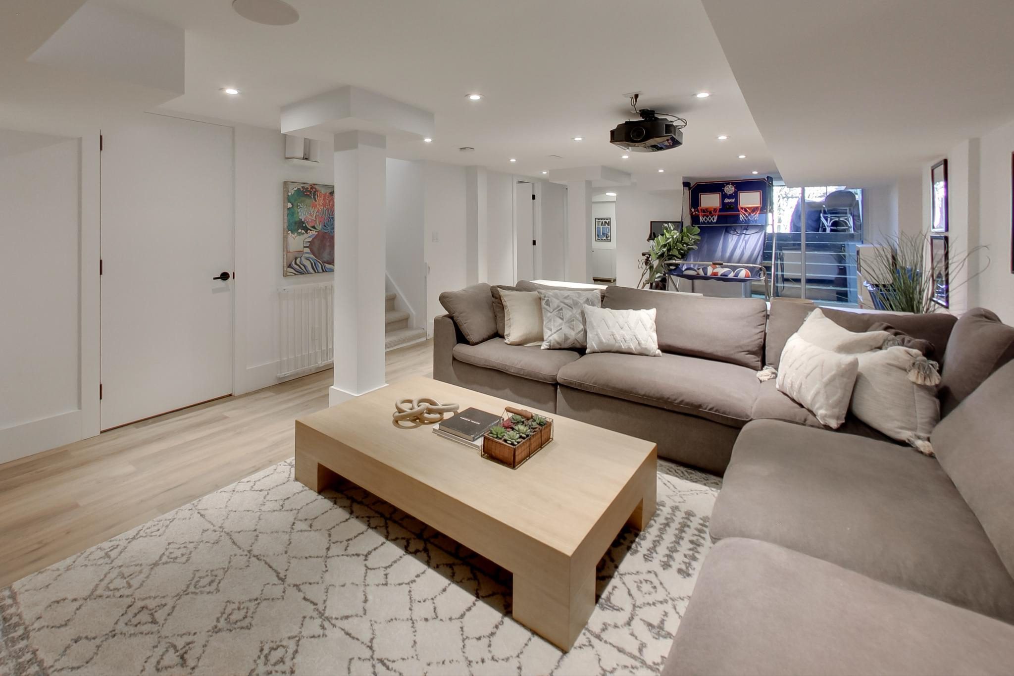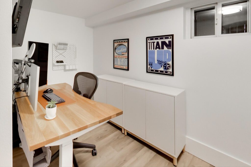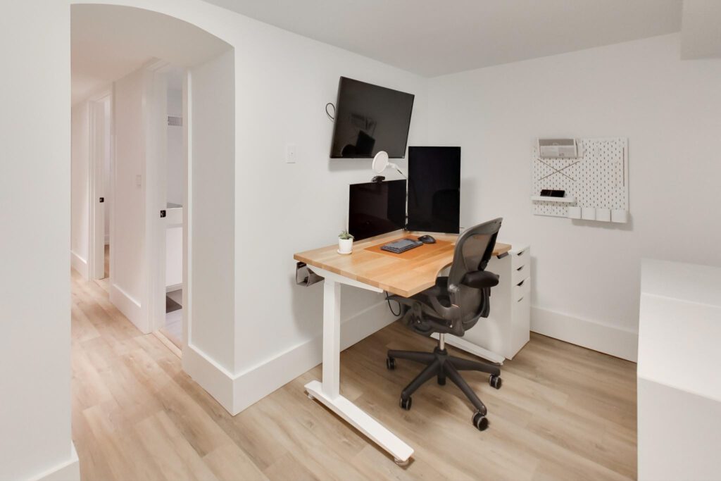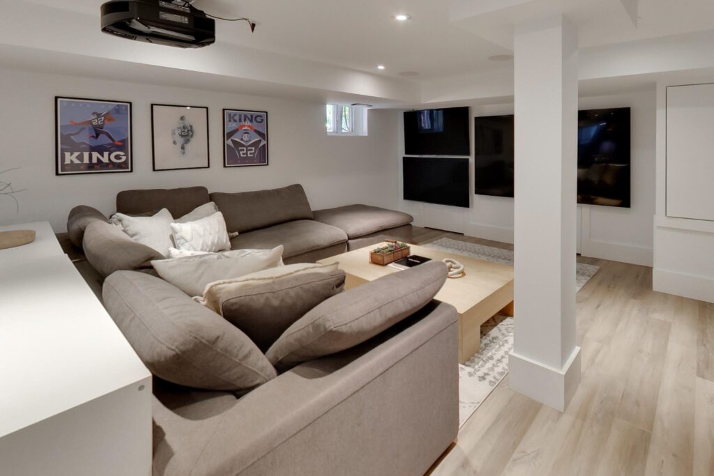 The lower level offers an ideal family space with a media room, laundry room, separate office, and a stylish three-piece bathroom featuring a floating vanity and glass shower.
