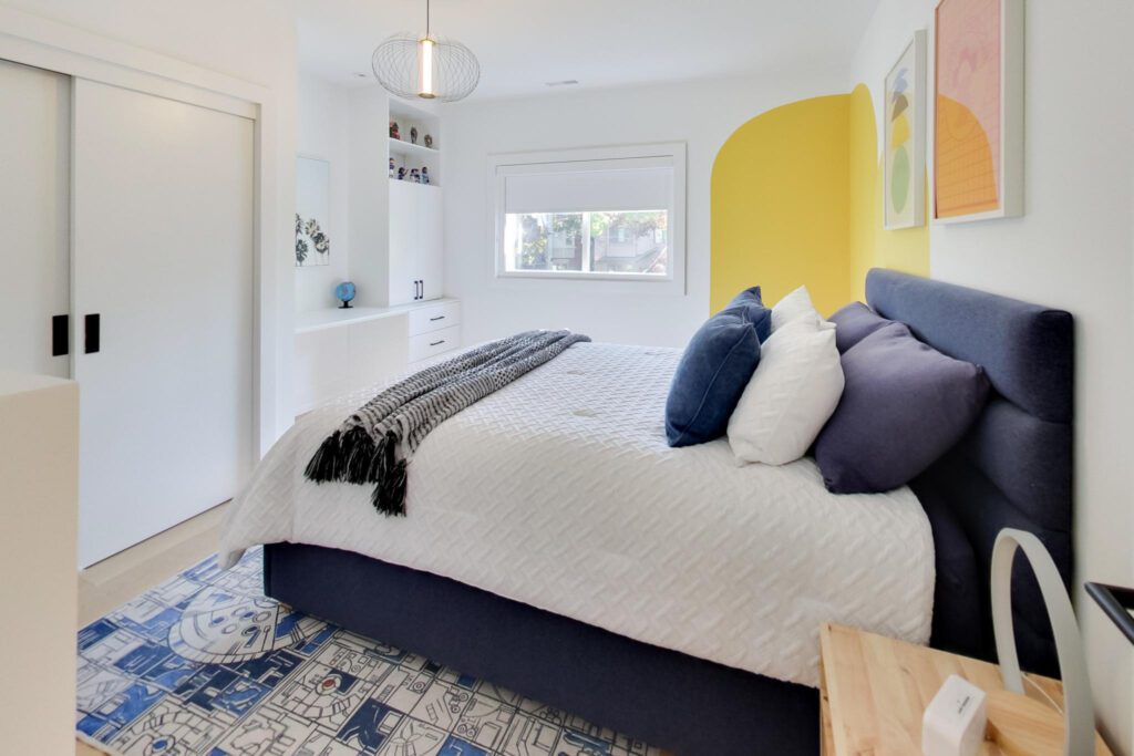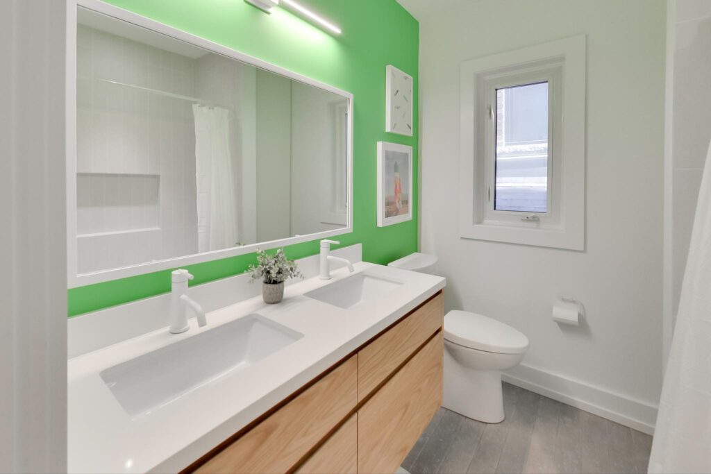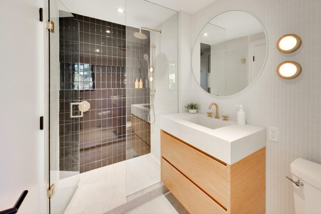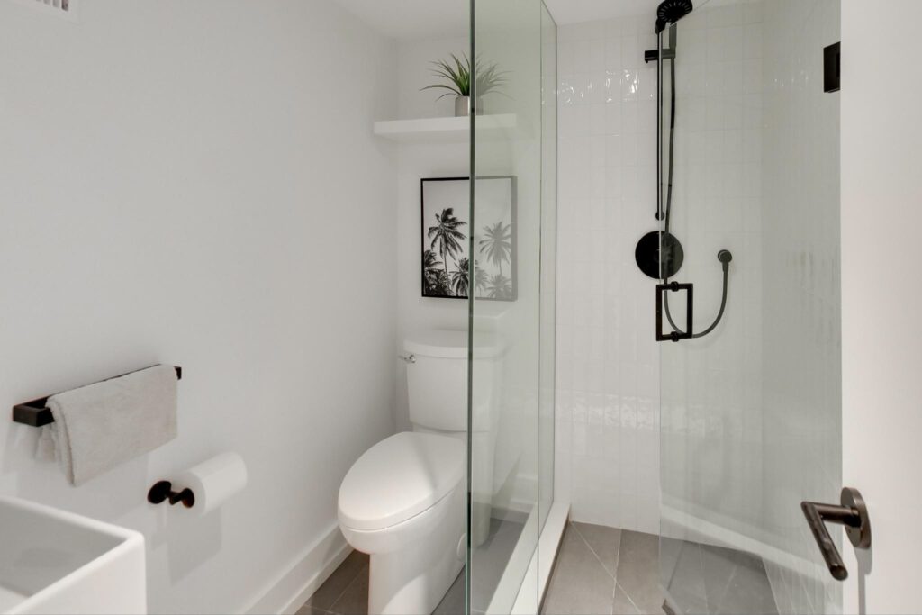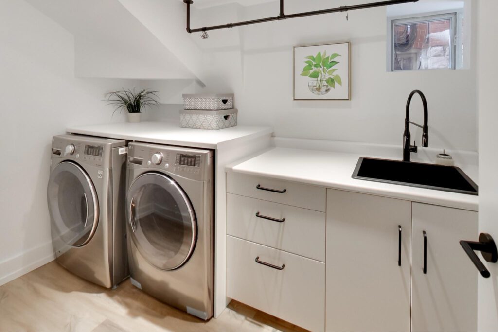 The lower level offers an ideal family space with a media room, laundry room, separate office, and a stylish three-piece bathroom featuring a floating vanity and glass shower.
