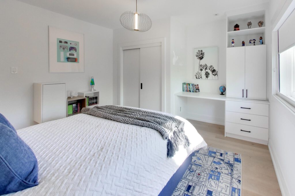 Adjacent to the kitchen, the family room features a wall of custom built-ins and a tucked away desk, with a seamless walkout to a covered deck and a backyard playground.