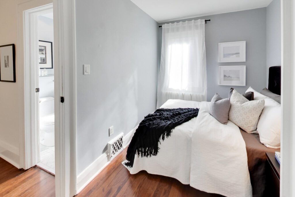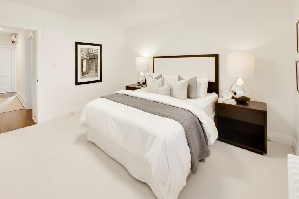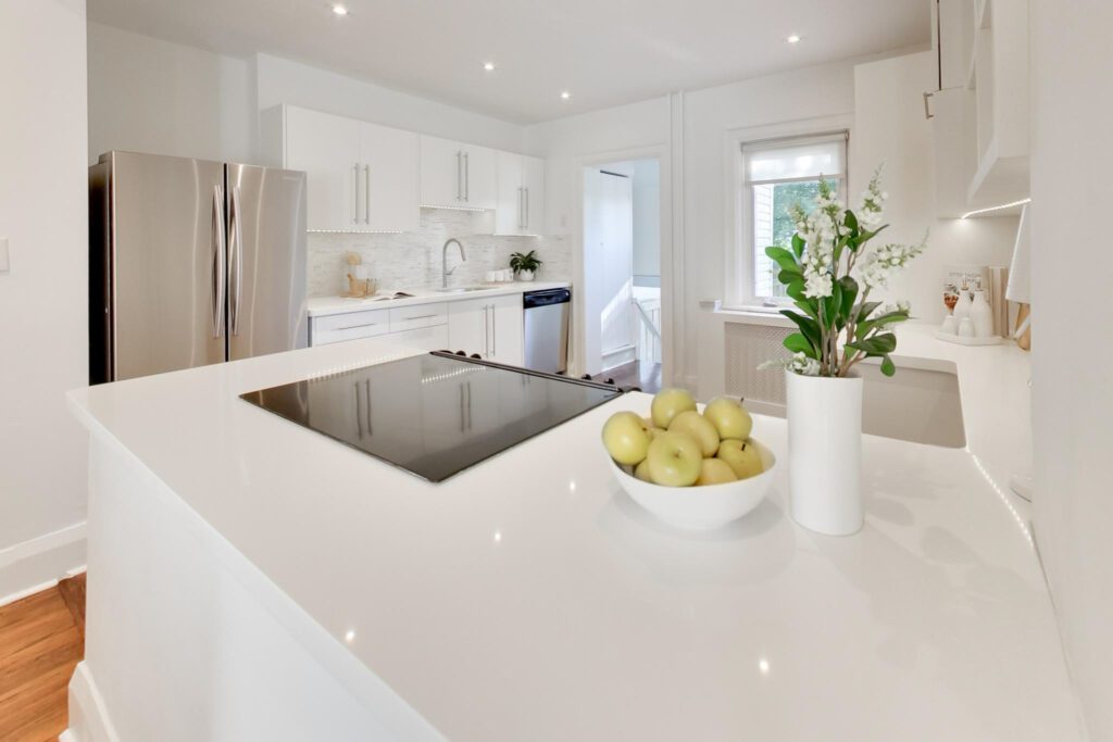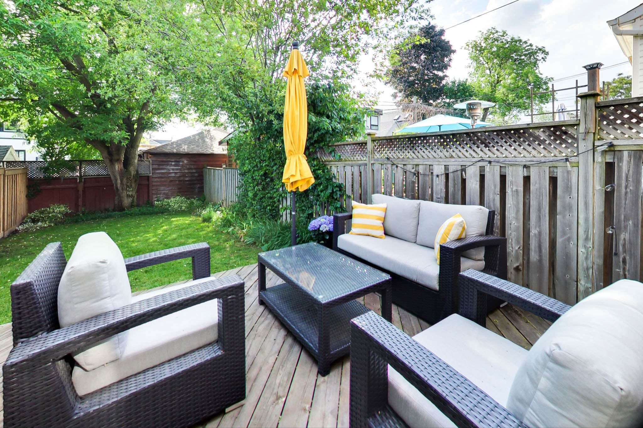 The stylish U-shaped kitchen, a personal favorite, offers ample quartz countertops and a crisp marble backsplash. Step out into your private garden oasis—lushly treed for ultimate harmony and peace, with an expansive deck perfect for summer BBQs and outdoor gatherings.