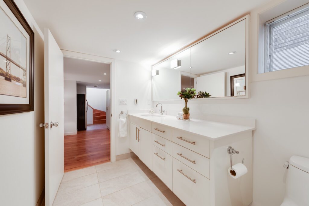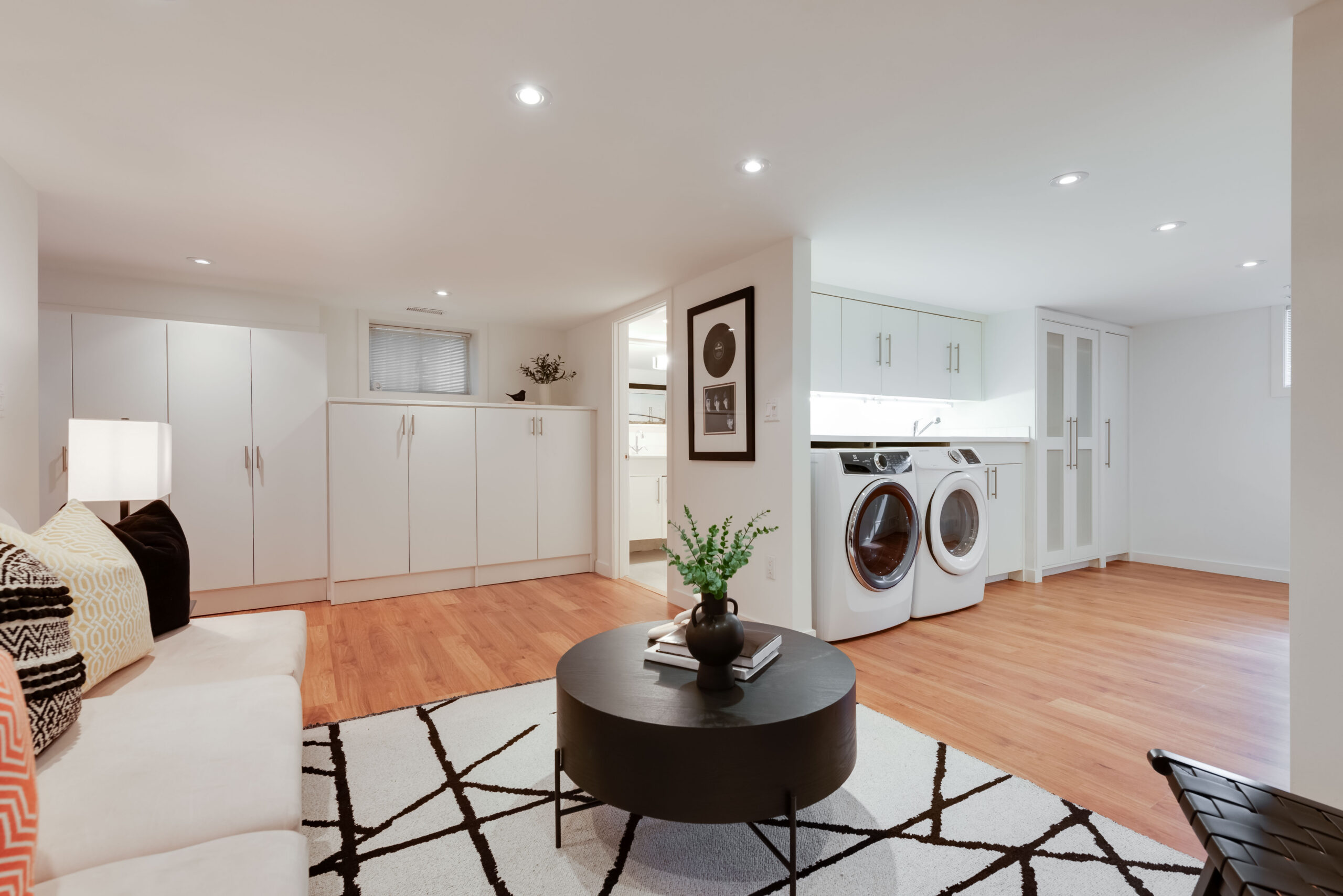 The lower level offers a welcoming media room that’s perfect for movie nights, with above-grade windows and six-and-a-half-foot ceiling height making it airy and bright, built-in storage, a beautifully finished, massive bathroom with a heated floor and a well-equipped laundry area.