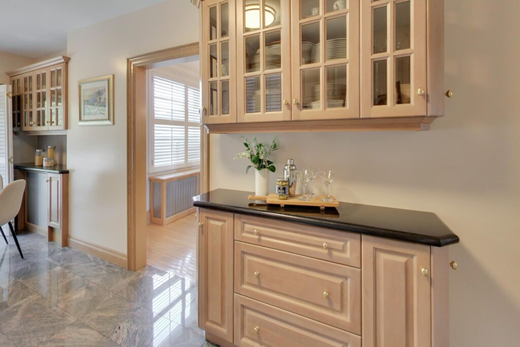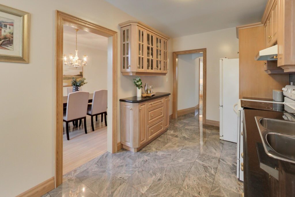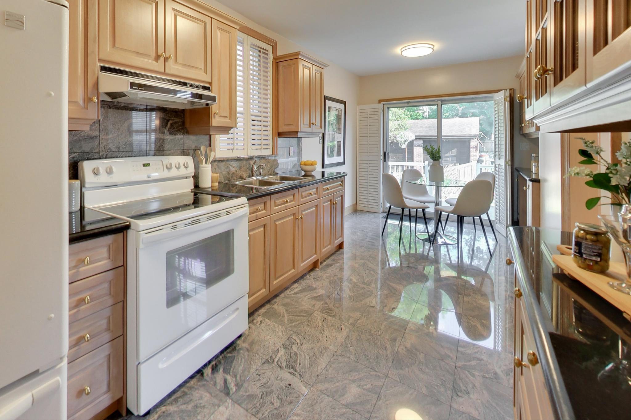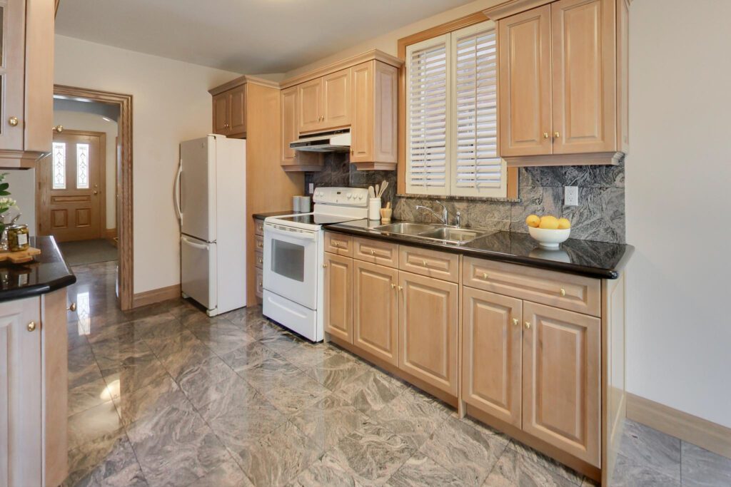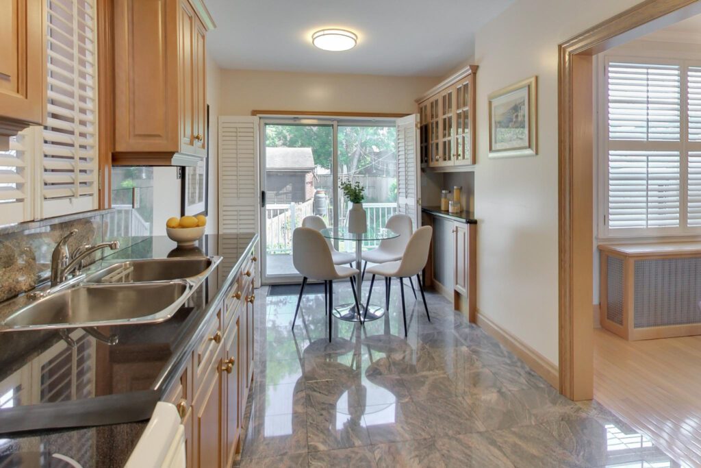 Inside, you’ll find spacious principal rooms with original details including plaster crown molding, a decorative fireplace with granite surround, and hardwood floors. The renovated eat-in kitchen features granite countertops, backsplash, and flooring, with a walk-out to a large, fenced backyard—ideal for entertaining or future expansion.