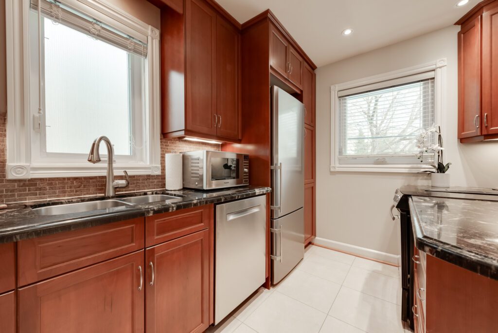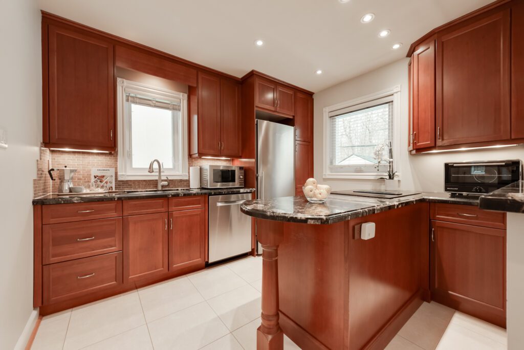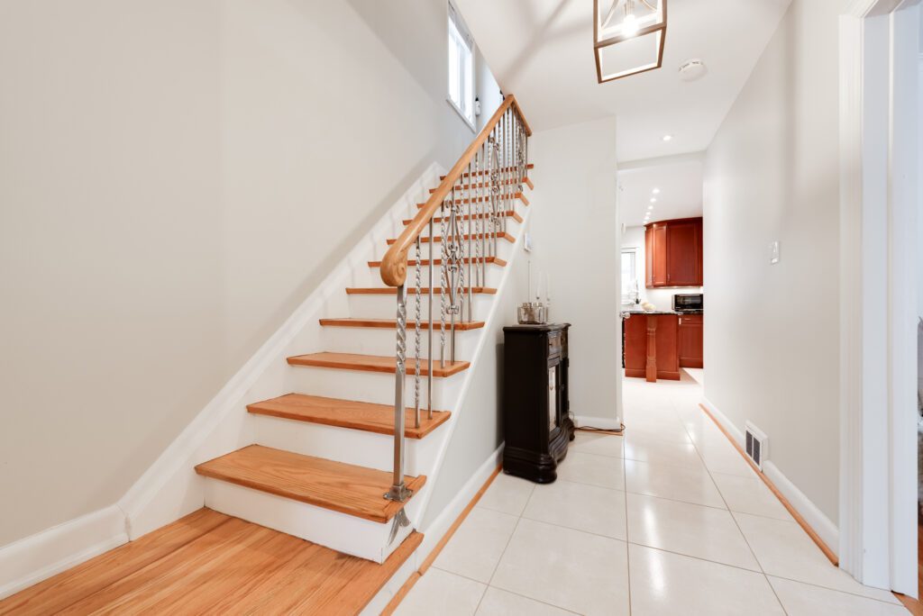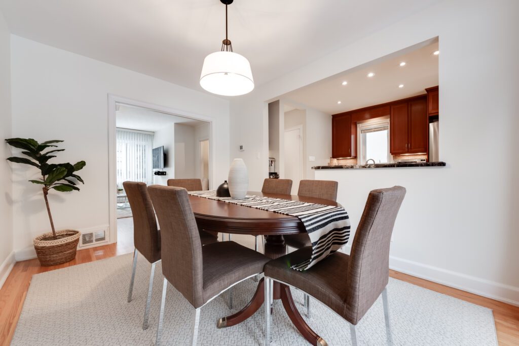 Inside, the thoughtful layout features a coveted powder room and a deep, double coat closet. The custom kitchen, complete with a peninsula island and coffee station, flows seamlessly into the dining area, where a walkout leads to a backyard with views of Arlington Parkette and the Cedarvale Ravine.