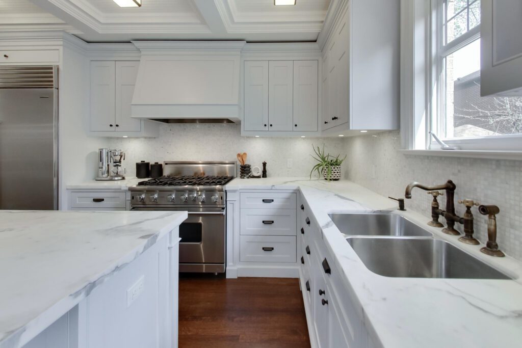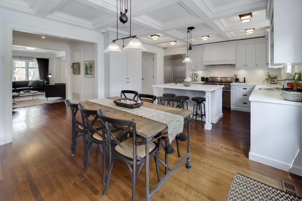 Soaring ceilings and hardwood floors provide a canvas of airy elegance, punctuated by refined architectural details like tongue-and-groove coffered ceilings, Carrara marble, and the culinary precision of a Sub-Zero refrigerator. The main floor is a model of practical luxury, featuring a dedicated home office and a serene powder room.