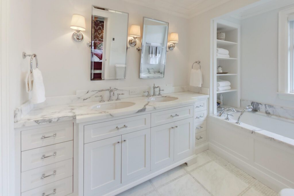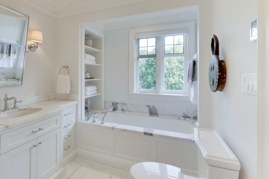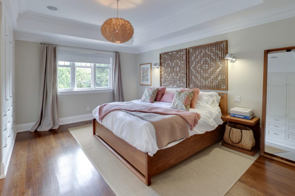The primary retreat is nothing short of spectacular—a private sanctuary featuring wall-to-wall bespoke cabinetry, a walk-in closet, and a spa-like five-piece ensuite with heated floors and classic marble finishes. Two additional bright bedrooms, each with integrated organizers, offer comfort for family or guests.