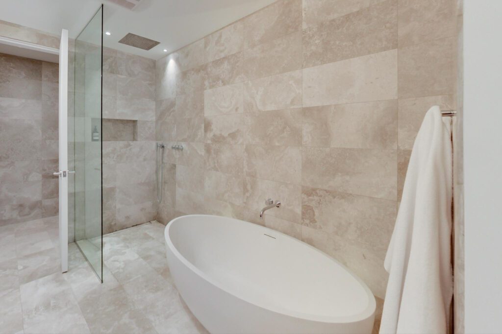 Upstairs, the vaulted primary suite is a private sanctuary with a Porro walk-in closet and spa-like ensuite boasting heated limestone floors, double walnut vanities, a soaker tub, and a lipless walk-in shower. Two additional bedrooms, a marble-clad main bath with skylight, and a full laundry room complete the second floor.
