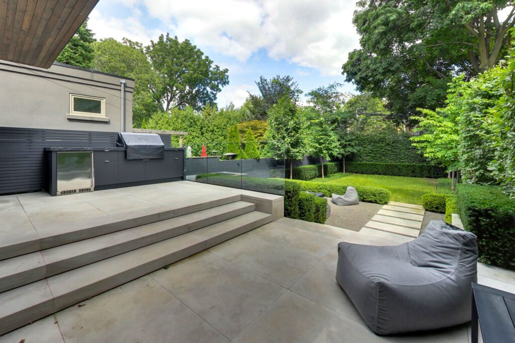 The outdoor living is as compelling as the interior. A limestone terrace, outdoor kitchen with Lynx grill and Marvel fridge, Sonance speakers, fire pit, irrigation system, and lush English-style landscaping make entertaining a dream.